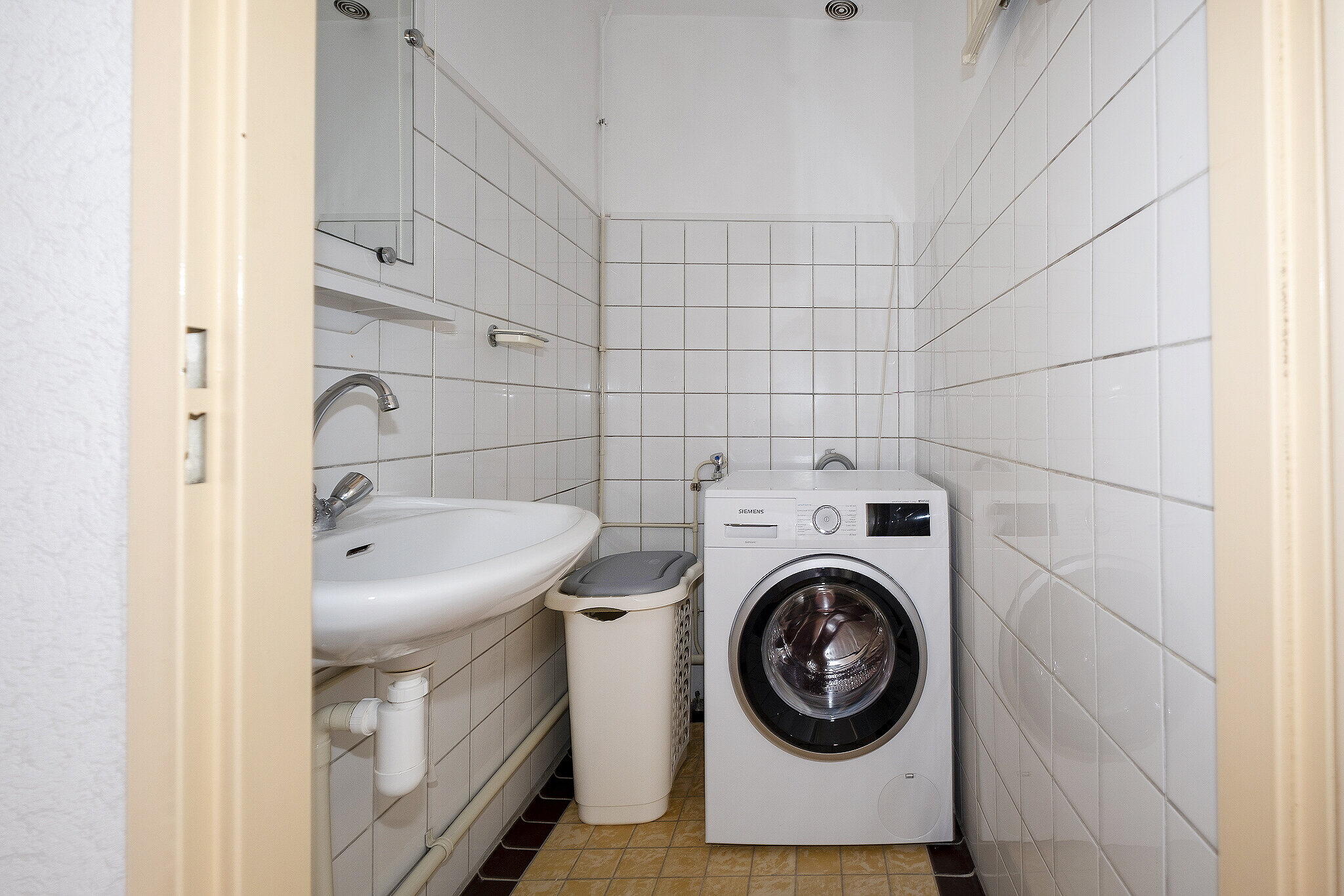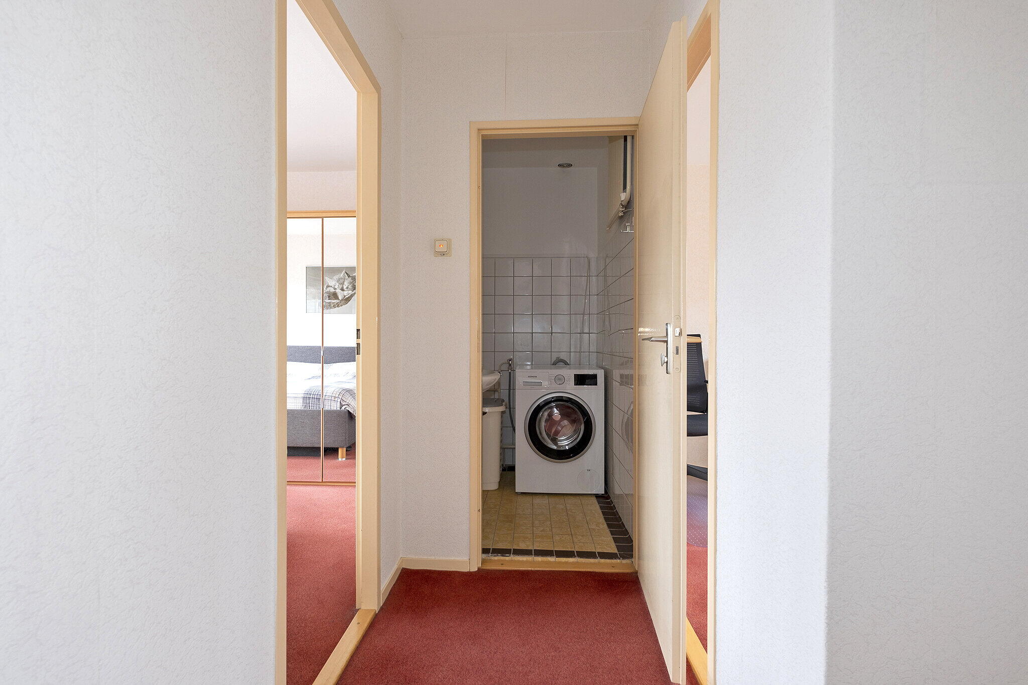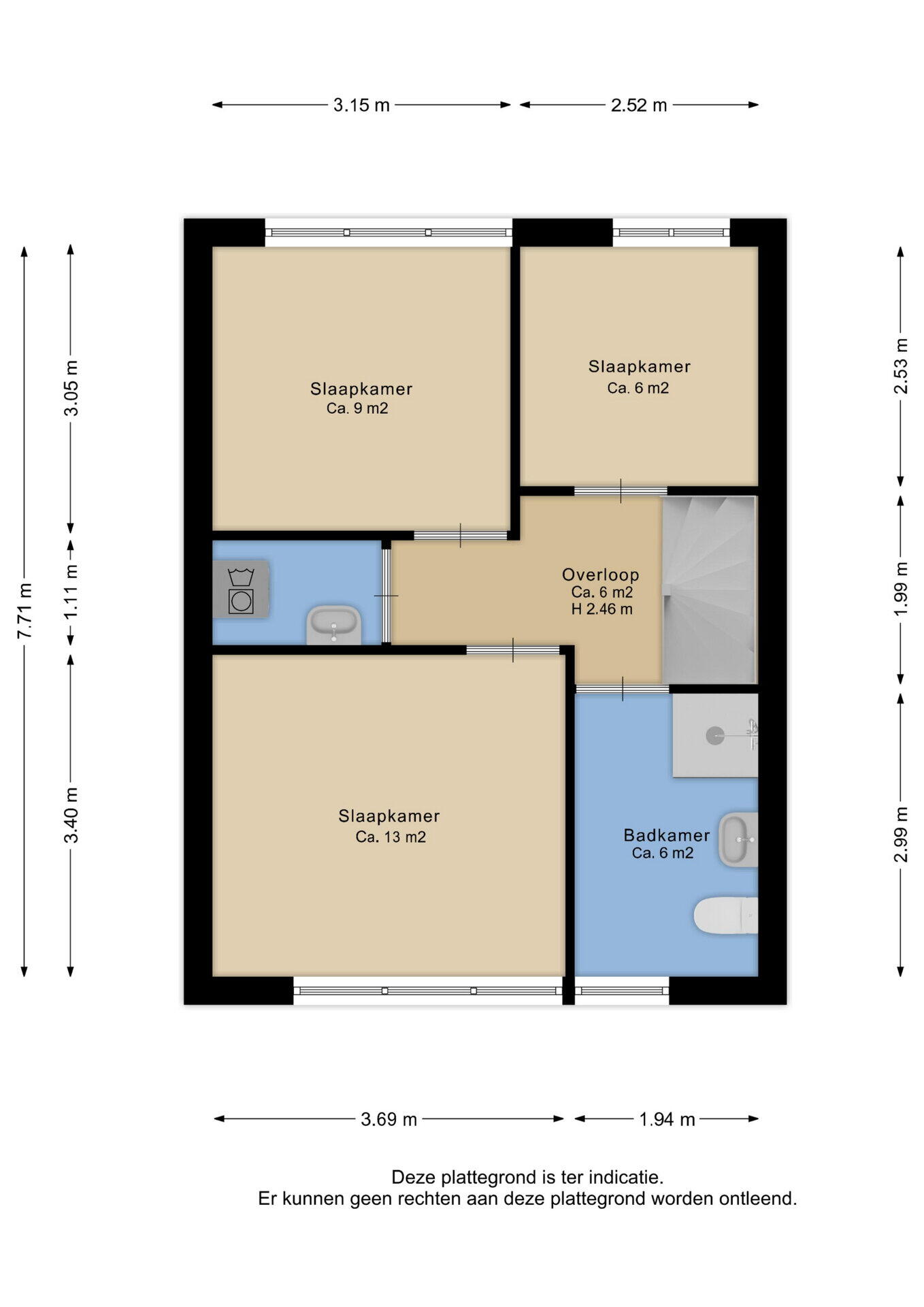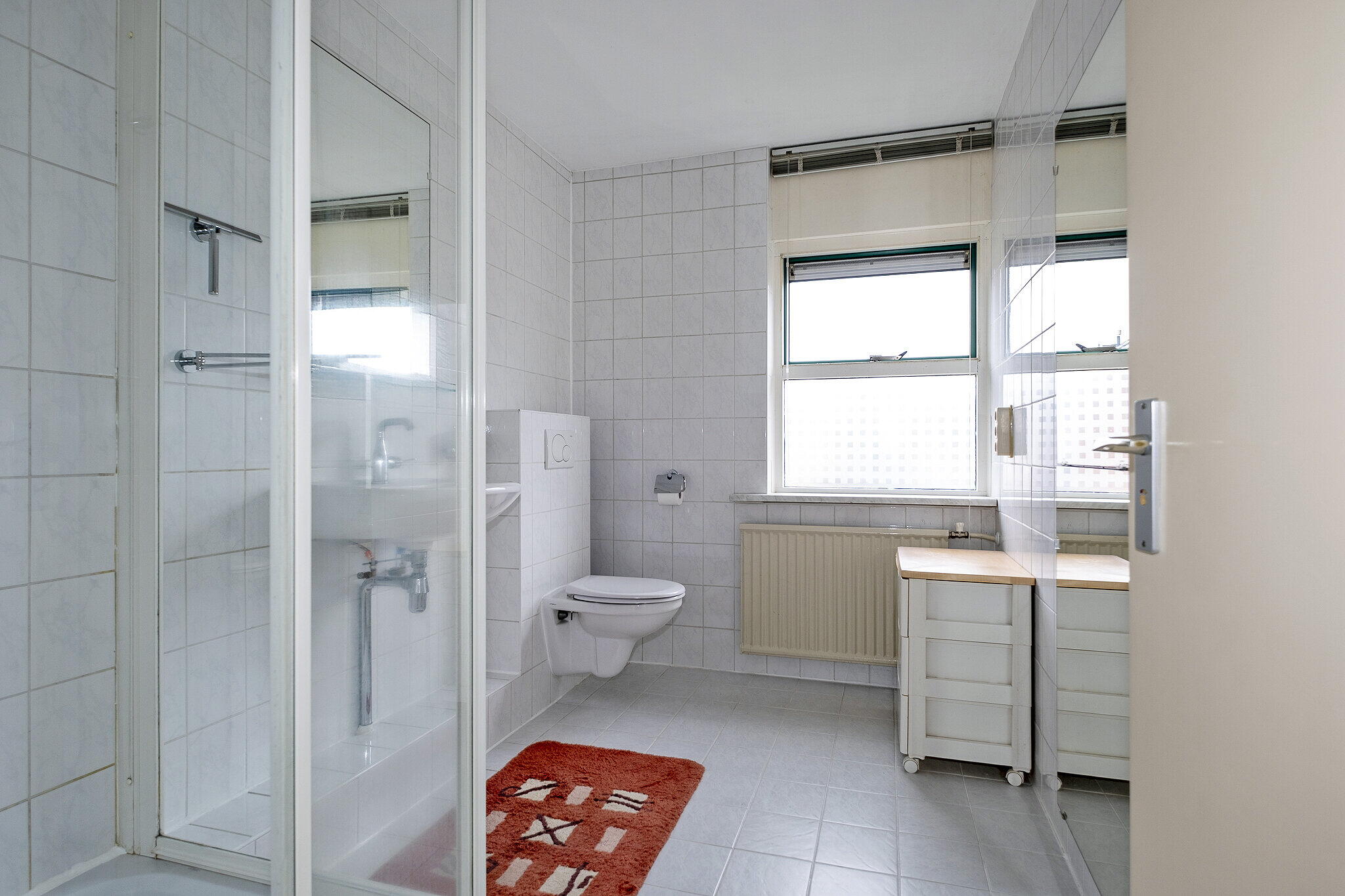 Overloop met drie slaapkamers (ca. 13m², ca. 9m², en ca. 6 m²). De badkamer (ca. 6m²) is voorzien van een douchehoek, een vaste wastafel en een tweede toilet. Verder is er op de eerste verdieping een wasruimte aanwezig met aansluiting voor de wasmachine en een wastafel.