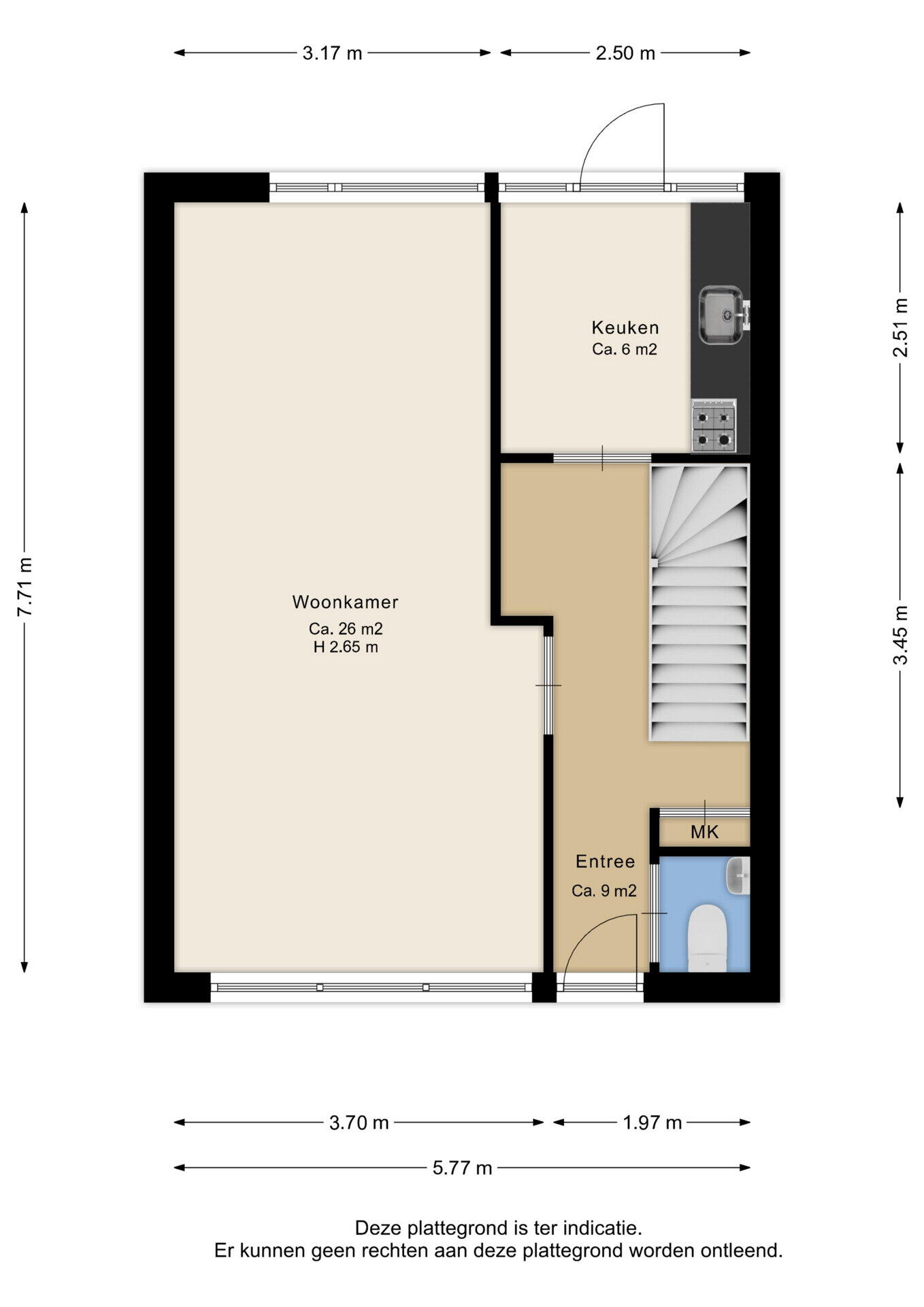 Entree in de hal met toilet, meterkast en trapopgang. De ruime woonkamer (ca. 26m²) betreft een doorzonkamer waarbij grote ramen zorgen voor veel natuurlijk lichtinval. De eenvoudige keuken heeft geen inbouwapparatuur en beschikt over een los gasfornuis en afzuigkap. Via de keukendeur loop je zo de achtertuin in.